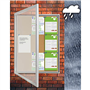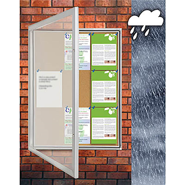 The ideal information display case for outdoor areas Unique water resistant design with internal rubber seal No visible hinges - internal pivoting design Aluminium frame in satin silver finish, 50mm face Back board in Bulletin board cork For added integrity the back of each case is laminated 12 month manufacturers warranty