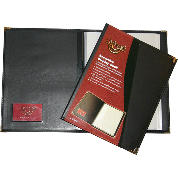 Traditional vinyl fixed pocket display book with copy safe pockets, metal corners and card window on inside of front cover