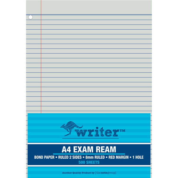 WRITER EXAM PAPER 55GSM 8MM RULED 1 HOLE PUNCHED A4 WHITE 500 SHEETS