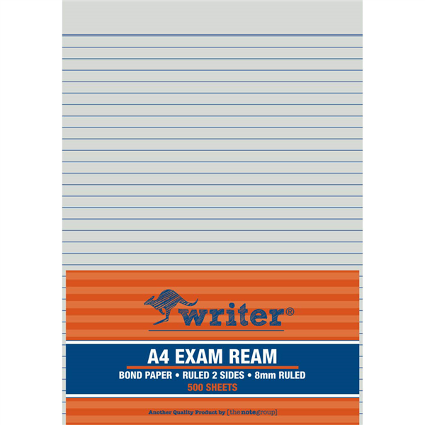 WRITER EXAM PAPER 55GSM 8MM RULED UNPUNCHED A4 WHITE 500 SHEETS