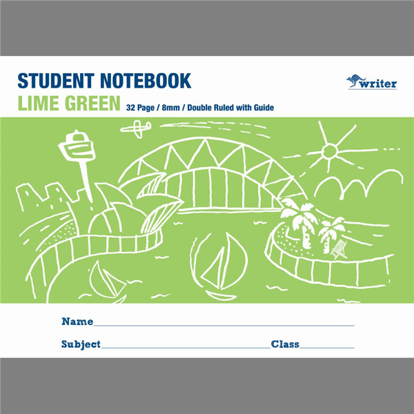 WRITER STUDENT NOTEBOOK 8MM DOUBLE RULED/GUIDE 32 PAGE 250 X 175MM LIME
