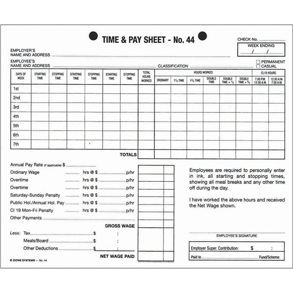 Specially designed for the hospitality industry as well as industry generally Weekly sheet of employee details and daily worked times with space for signature 2 hole punch Recyclable