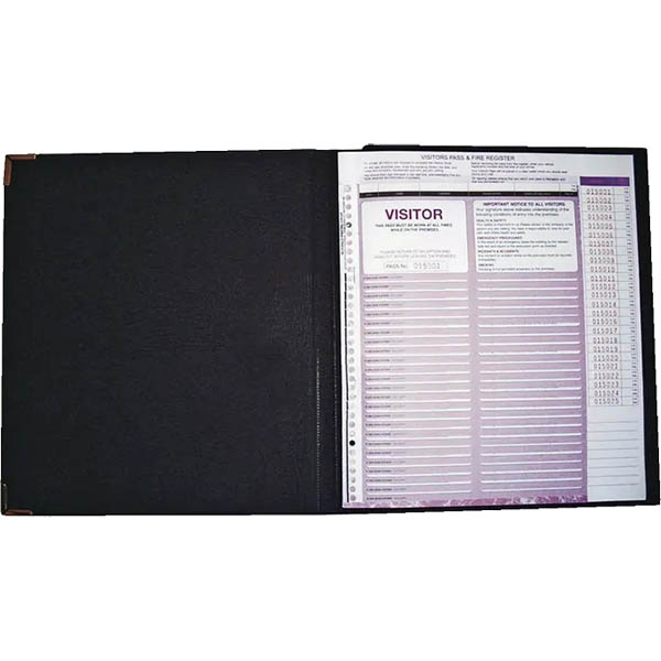 Every visitor receives a personal Visitors Pass which is written out and issued The register is in a 'security' format, it means that no one can see who has signed in previously The Visitors Pass Kit comprises three parts Visitors Pass Register - Bound book containing 250 Visitors Pass slips, 25 to view Visitors Pass Binder - Quality black padded binder, gold blocked 'Visitors' with protective brass corners. Built in writing plate forms part of the binder Visitors Pass Plastic Wallet Special plastic wallet (with clip) to hold Visitors Pass slip